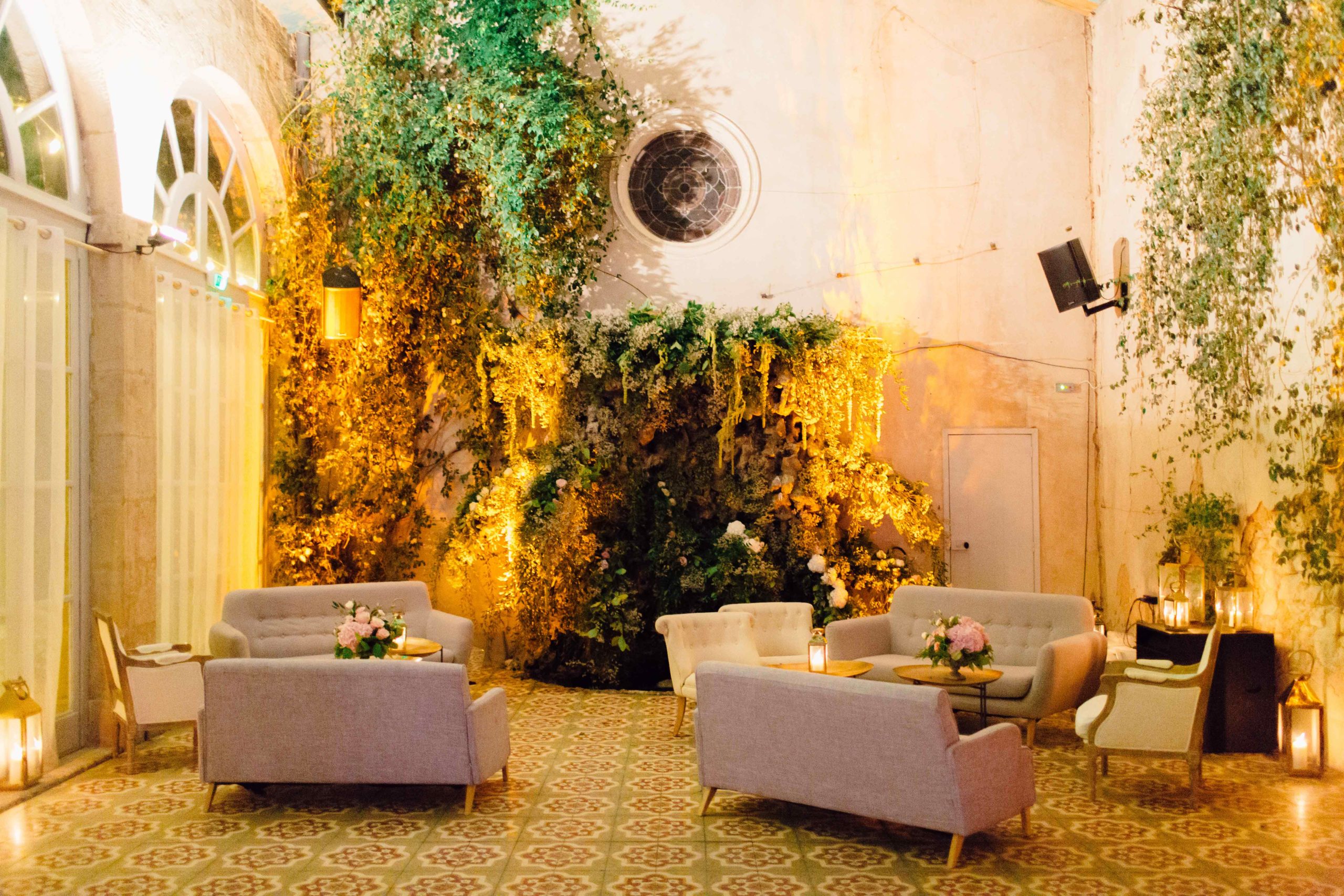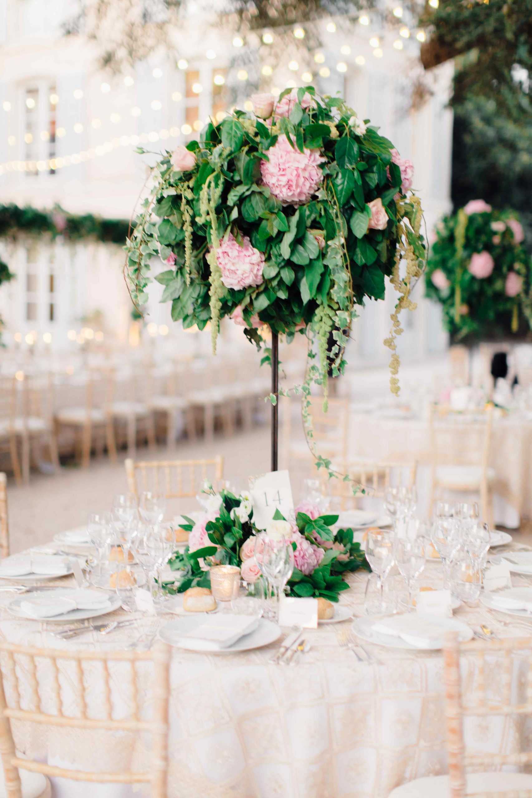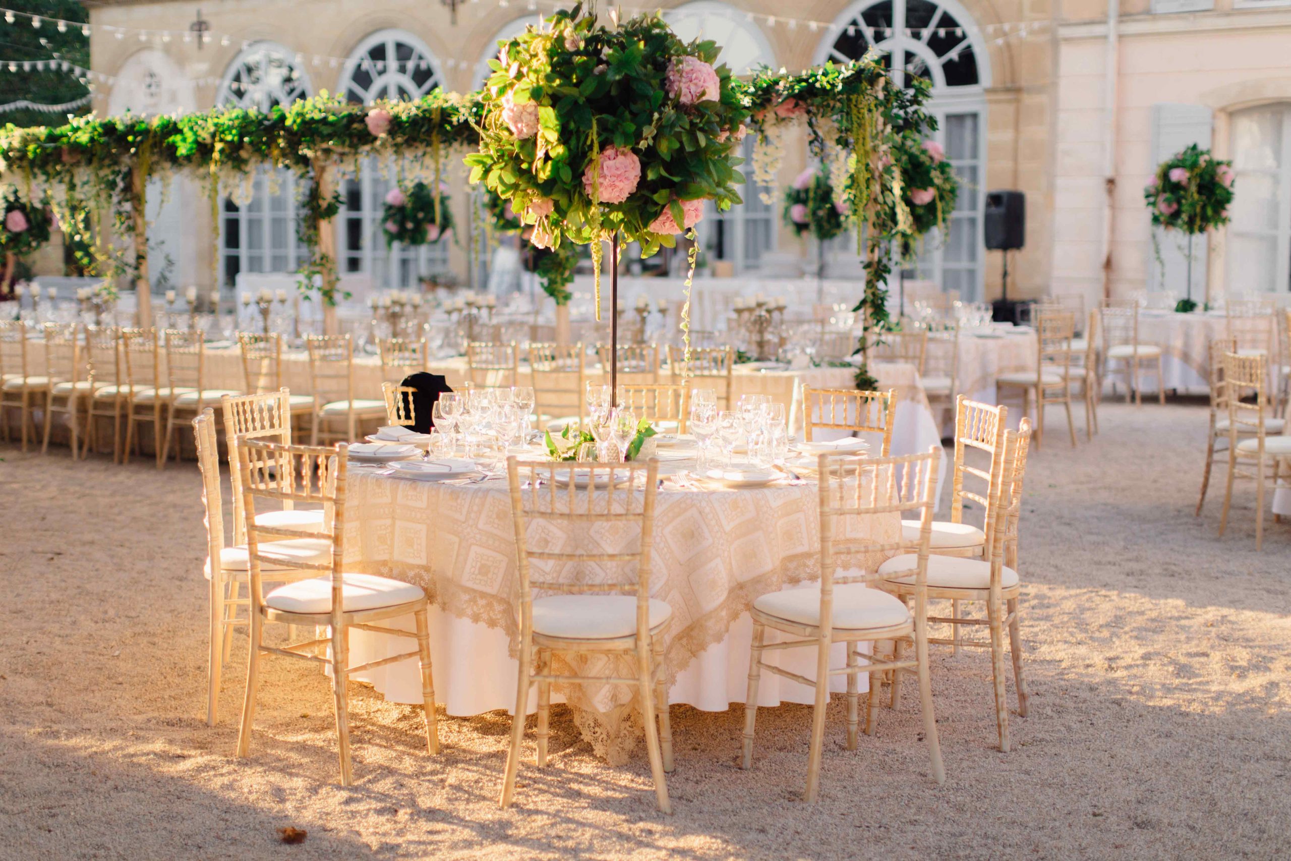 De la cérémonie religieuse, capitale pour les mariés et leurs familles, à l’espace diner, rien n’a été laissé au hasard. Le ton était donné avec des centres de tables remarquables, avec des boules de fleurs très végétales perchées sur des pieds en fer forgé.