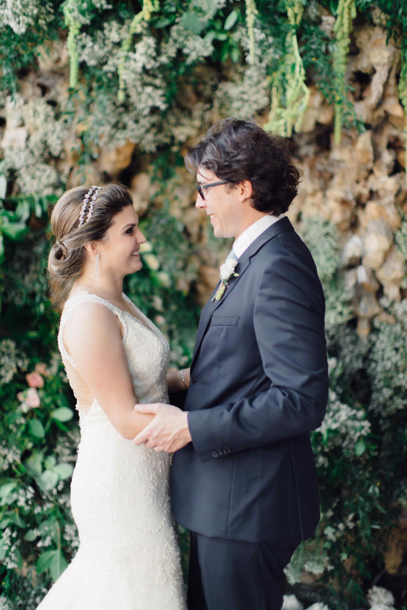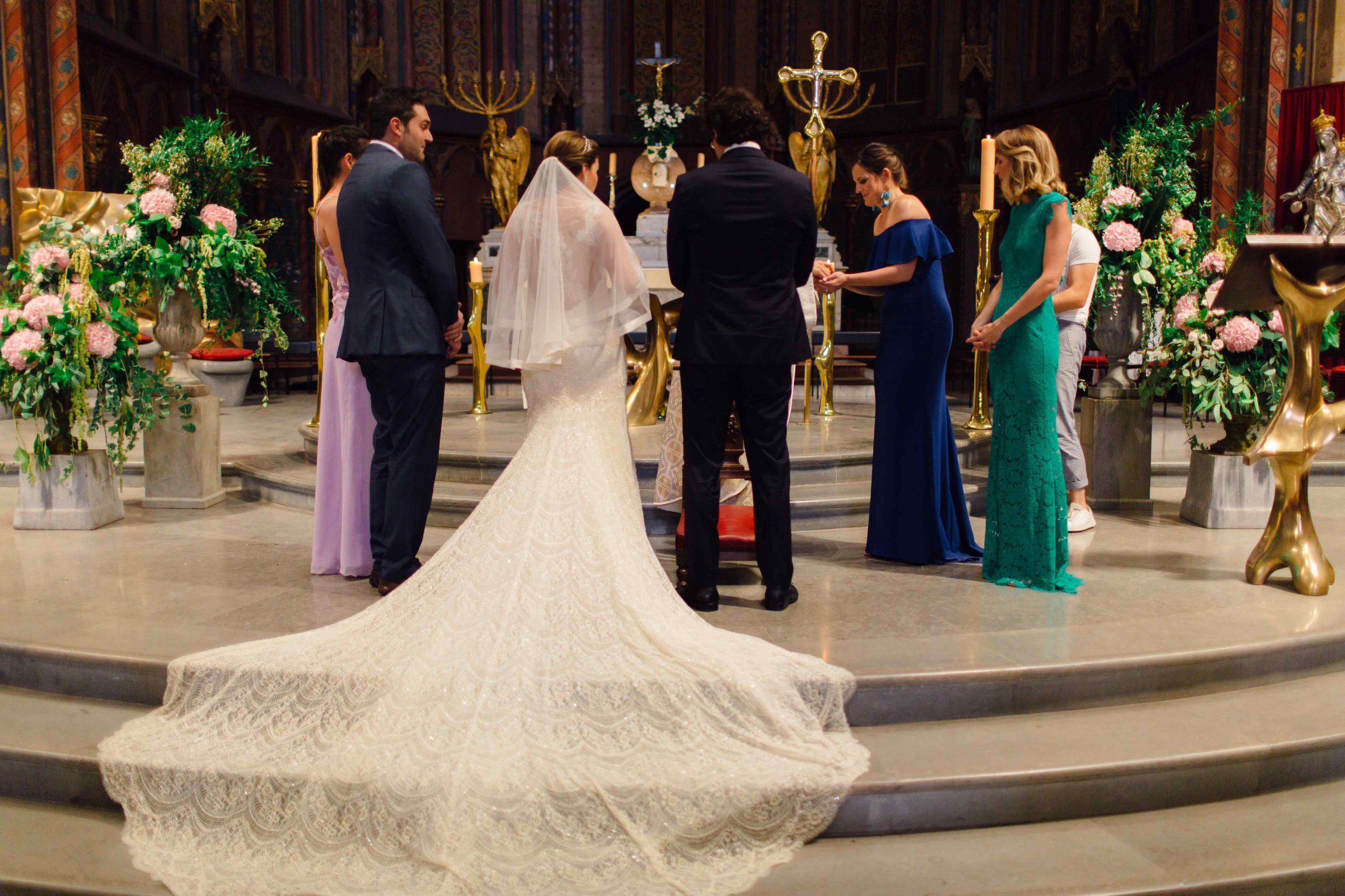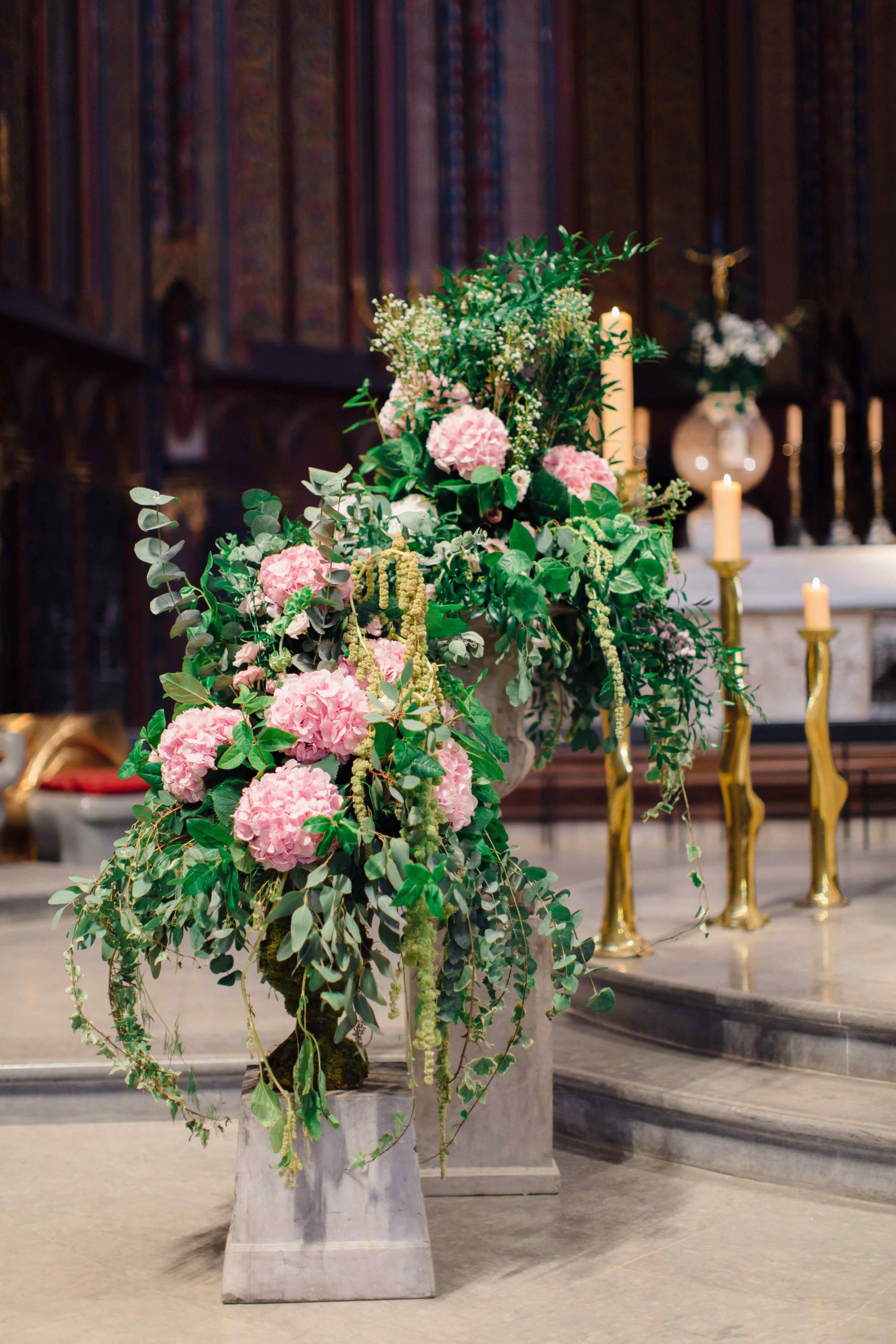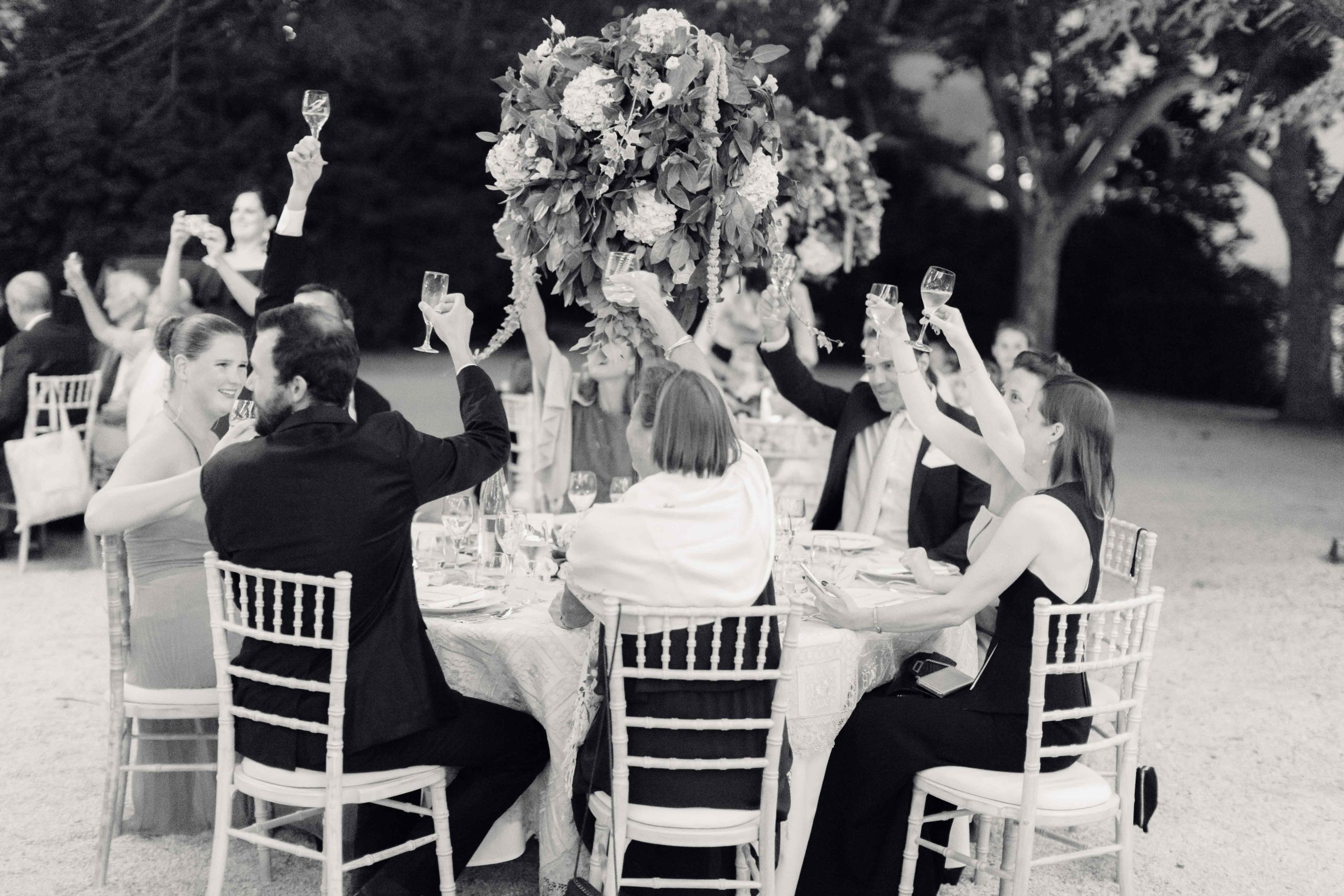 De la cérémonie religieuse, capitale pour les mariés et leurs familles, à l’espace diner, rien n’a été laissé au hasard. Le ton était donné avec des centres de tables remarquables, avec des boules de fleurs très végétales perchées sur des pieds en fer forgé.