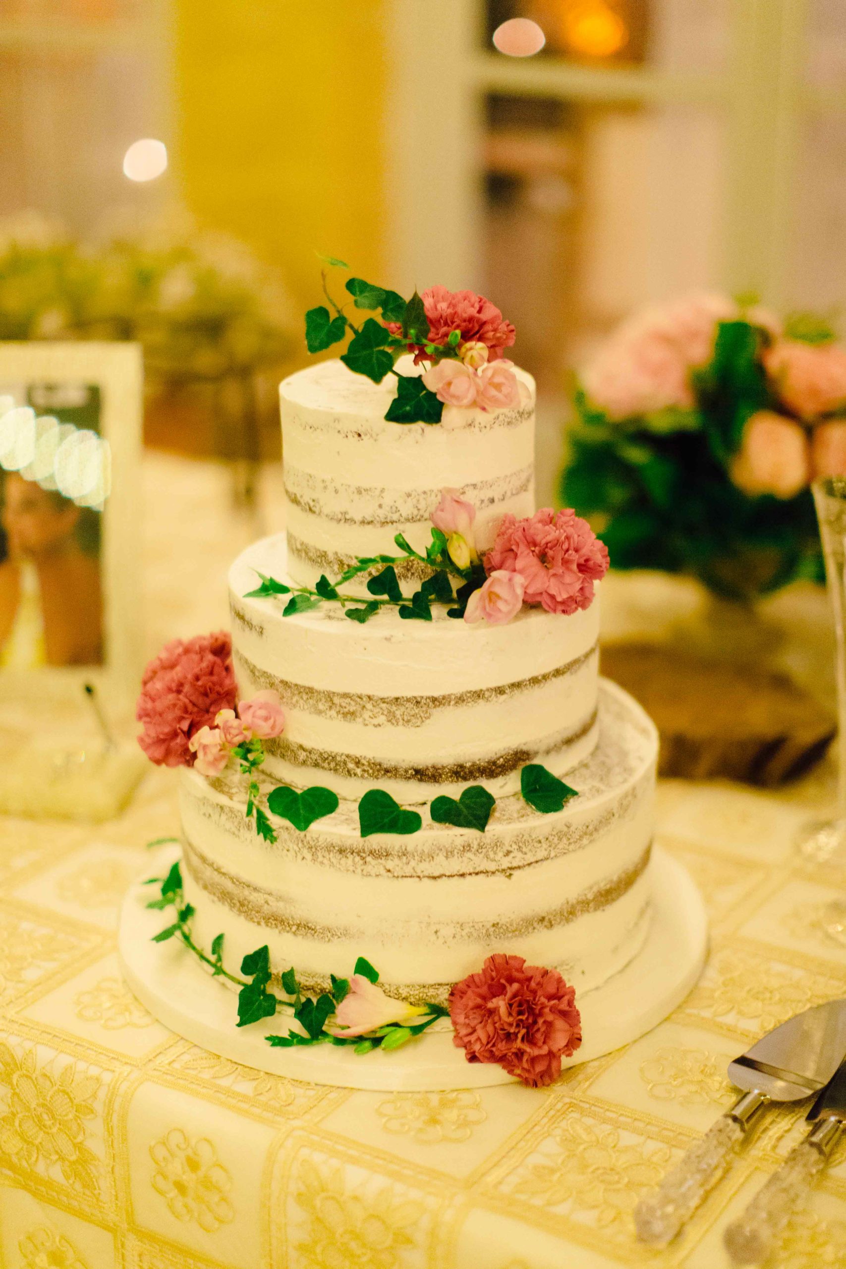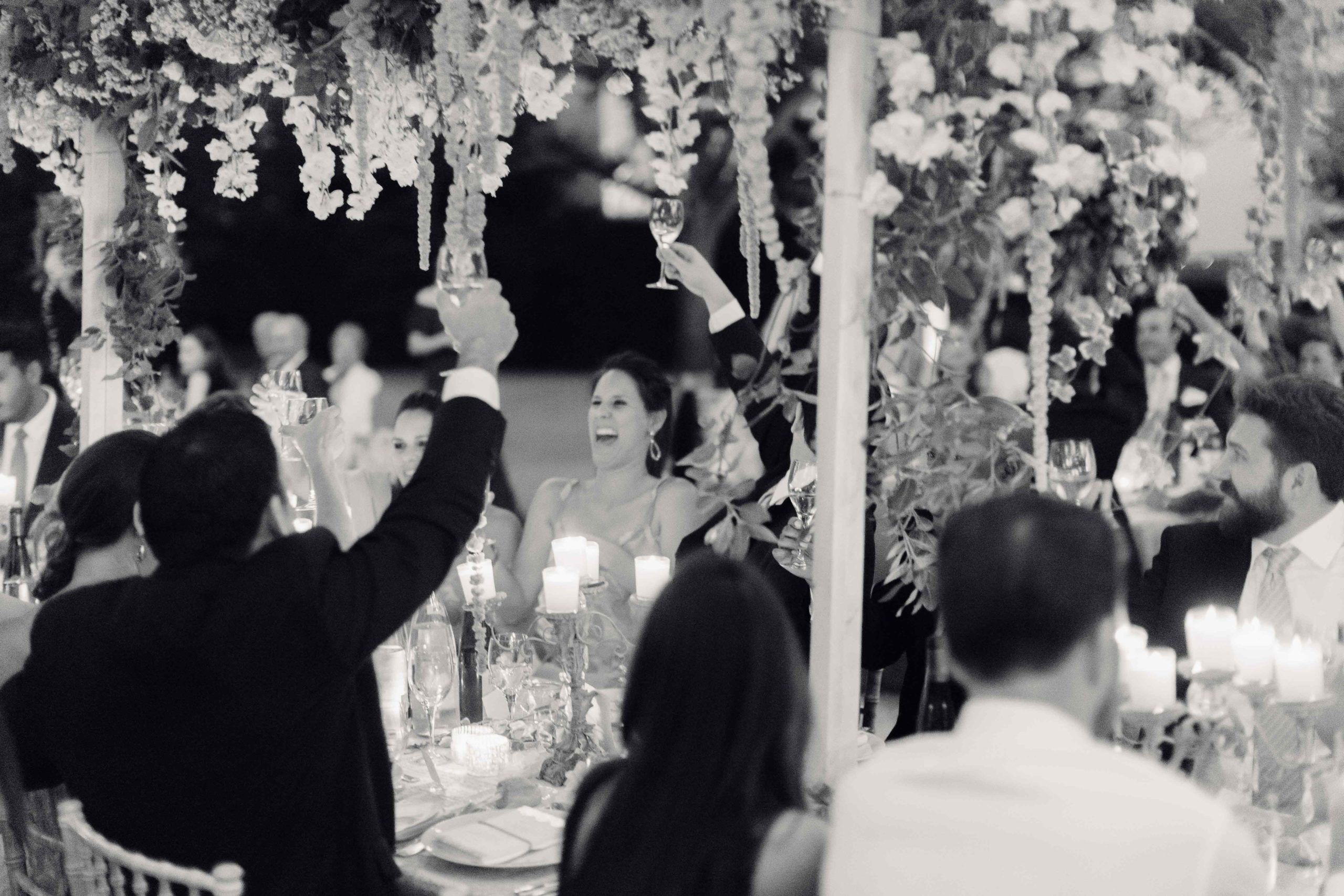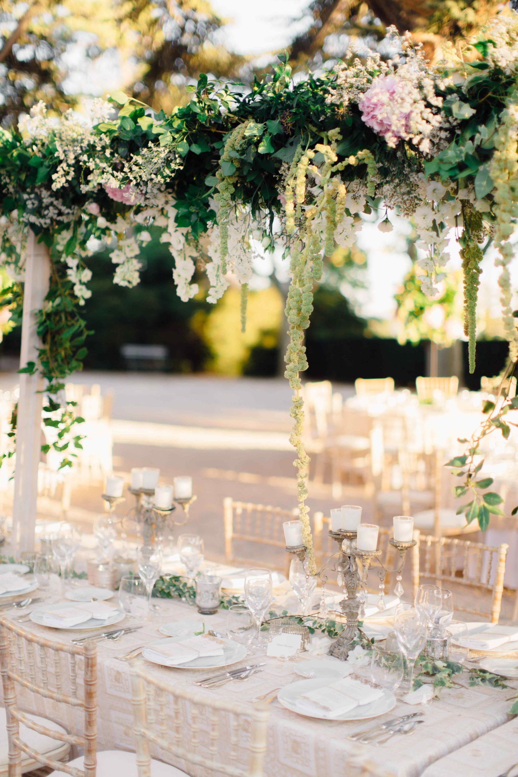 La table des mariés se mettait en avant grâce à son jardin suspendu spécialement conçue pour l’occasion : près de 10 mètres de fleurs suspendues qui ont donné une ambiance chaleureuse.